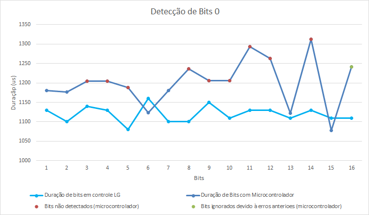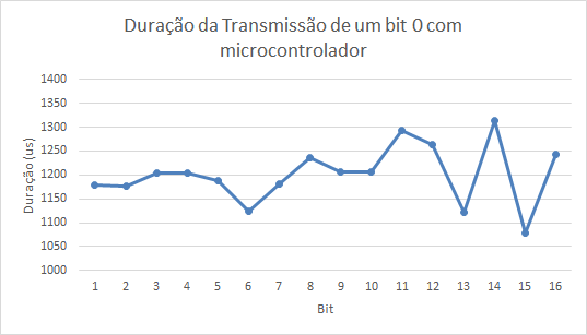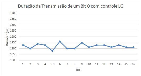 Essa é a duração total para transmitir cada bit. Os bits do controle LG são enviados com durações muito próxima, enquanto os do meu microcontrolador não somente possuem uma diferença maior, como o valor médio também é mais alto. Isso se mostra um ponto crucial a seguir.