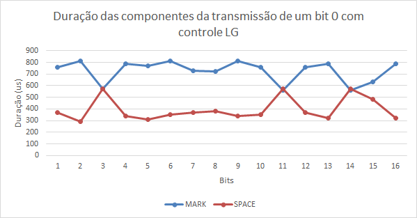 Mostrando os valores separados entre MARKs e SPACEs, há algo bem interessante a ser visto. As durações de cada parte variam muito, mas de forma que o valor total seja praticamente constante. Quando há uma queda na duração do MARK, SPACE dura mais para compensar.