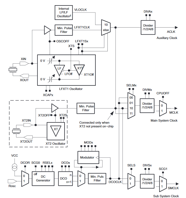 Cada microcontrolador possui diferentes fontes de clock (interno, externo e baixa ou alta frequência) que alimentam as diferentes partes do microcontrolador. Os periféricos não são alimentados diretamente pela fonte de clock, mas por sinais de clock, chamados de Master Clock (MCLK) e Sub-main Clock (SMCLK). A combinação entre fontes de clock e sinais de clock pode rapidamente se tornar complexa tão tantas partes móveis a serem consideradas. E isso antes de levar em consideração que o clock pode ser alterado durante o funcionamento do microcontrolador. Usar um diagrama, como o da figura a seguir, ajuda a identificar todas as partes do sistemas de clock sem precisar passar por várias páginas em um PDF. Vale notar que nem todos os elementos da imagem estão presentes em todos os microcontroladores, como é o caso do oscilador XT2 no MSP430G2452.