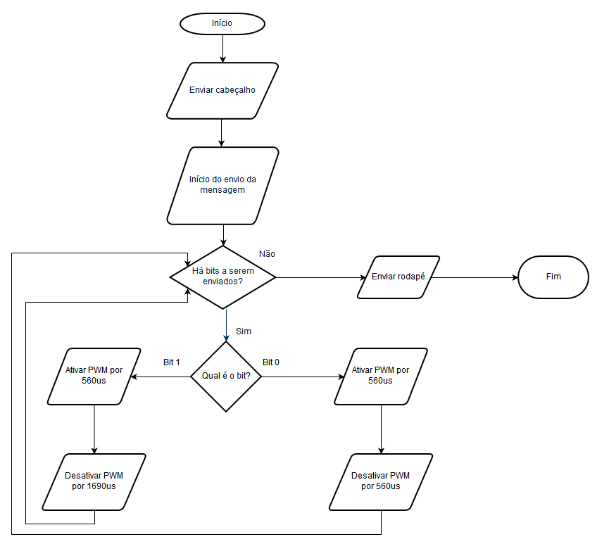 Para enviar os bits da mensagem, é preciso tratar de cada bit individualmente e em ordem. O fluxograma a seguir mostra isso, embora de forma simplificada.