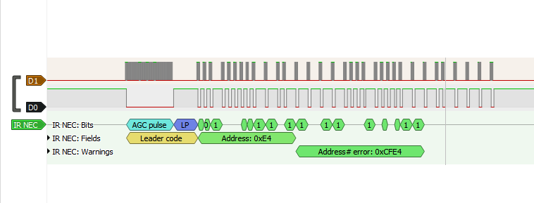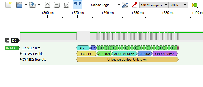 Mudar o clock possui outras implicações, como maior consumo de energia, então irei primeiro testar apenas diminuir a duração dos delays, levando em conta o tempo de processamento da CPU. Esse é um modo de tentativa e erro, portanto deve ser utilizado principalmente para atividades simples, como essa. Testando com diferentes valores, uma diminuição entre 20 e 30 ciclos para cada MARK e SPACE é suficiente para que a transmissão ocorra corretamente. Para testar, eu deixei o analisador lógico realizar capturas por mais tempo que o normal, esperando encontrar um erro, mas todas as transmissões foram capturadas e decodificadas corretamente.