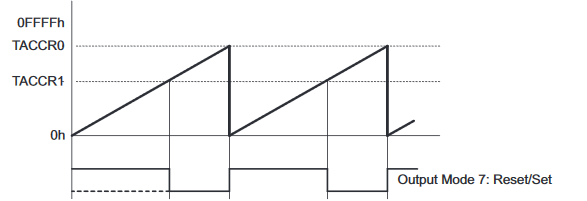 Para um transmissor com o protocolo NEC, o PWM deve ser 25% ou 33%. Se o período é controlador por CCR0, o duty cycle é controlado por CCR1 e a escolha do modo de saída. Por exemplo, no modo 1 a saída muda para um nível alto quando o timer é igual à CCR1 e permanece assim até que algo force a mudança. Esse é um modo não relacionado com PWM, então não é útil nesse caso. Para o PWM desejado, o modo escolhido é o 7. Conforme a imagem a seguir, ele gera uma saída baixa em CCR1 e uma saída alta em CCR0. Se CCR1 for ⅓ de CCR0, a saída passa ⅓ do tempo em nível alto e ⅔ em nível baixo, formando o duty cycle desejado. Novamente é preciso arredondar 26/3 para para 9. Ainda é preciso ver que efeito isso tem no sinal final.