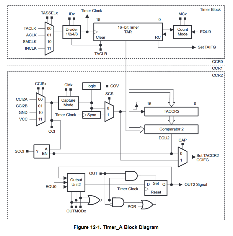 Resumindo o diagrama de blocos mostra que há um único contador, ligado à 3 submódulos, CCR0, CCR1 e CCR2. São esses submódulos que comparam a contagem com valores pré-definidos e disparam interrupções.